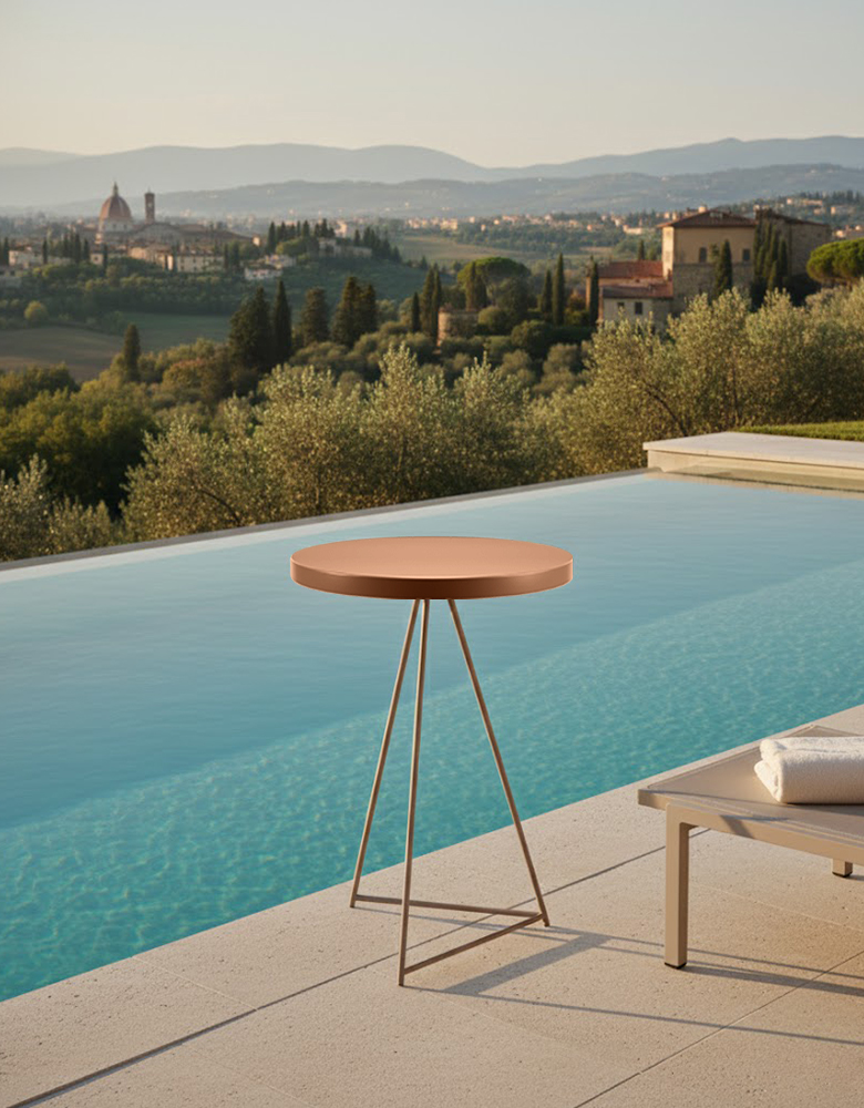 Honest materials meet meticulous craftsmanship in Aura’s construction. The table is forged from high-grade metal, finished with a sophisticated powder coating that feels velvety to the touch. This matte surface is designed to interact beautifully with natural light, softening the harsh glare of the midday sun and glowing warmly during the golden hour. Moving away from traditional lipped designs, the Aura features a perfectly flat circular top, providing a clean, seamless horizon that is as functional as it is aesthetic. Supported by a slender, minimalist tripod base, the table maintains an airy footprint, ensuring even the most curated spaces feel open and light.